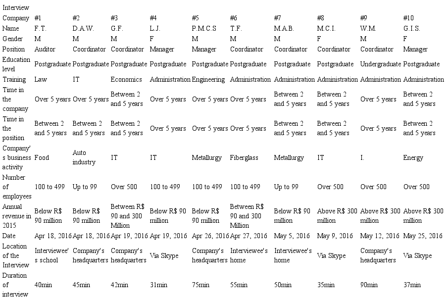 Regarding the level of education, nine respondents had postgraduate degrees (professional specialization or MBA) and one had an undergraduate degree. The training was predominantly in administration (six interviewees), but also in engineering, law, IT and economics.