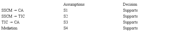 In terms of the assumptions, which do not imply statistical testing, it can be inferred that all of them support the anticipated answers to the formulated problem – that is, TIC plays a mediating role in the relationship between SSCM and CA. Briefly, the assumptions defined for solving the problem are shown in Table VIII.