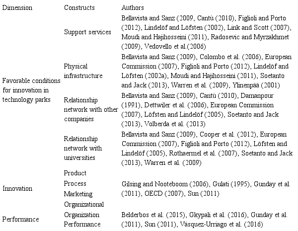 The constructs are presented here, with their variables and the potential relationships between them, based on empirical studies by several authors addressing the subject. Favorable conditions for innovation in technology parks are represented by support services, physical infrastructure, relationship networks with other companies and relationship networks with universities.