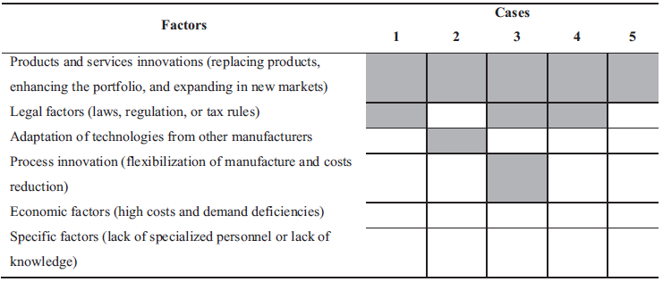 Another factor mentioned only by Interviewee 3 was the innovation process, involving flexibilization of manufacturing and cost reduction, a motive that was considered by Simantob and Lippi (2003) among the economic reasons to innovate. Red company innovated its manufacturing facility to obtain efficiency, machinery and processes gains, as it enabled flexibility to attend the entire chain and increase of the agility in selling and delivering products.