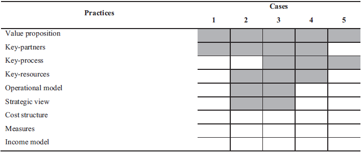 Figure 2 lists the practices studied in the literature with those used by companies to innovate in their BM. The data analysis shows that six of the nine BMI practices found in literature are used by the investigated companies. The innovation practices in costs structure, metrics and income model were not evidenced in the study. It is observed that new dimensions of innovation practices in BMI are not presented in the cases studied.