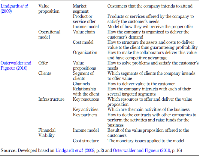 To deepen the understanding of the topic and its applicability, Osterwalder and Pigneur (2010) divide the BM into nine blocks. Complementing the concepts above, Lindgardt et al. (2009) divide BM into two great dimensions comprehending six elements. The two approaches are presented in Table II.