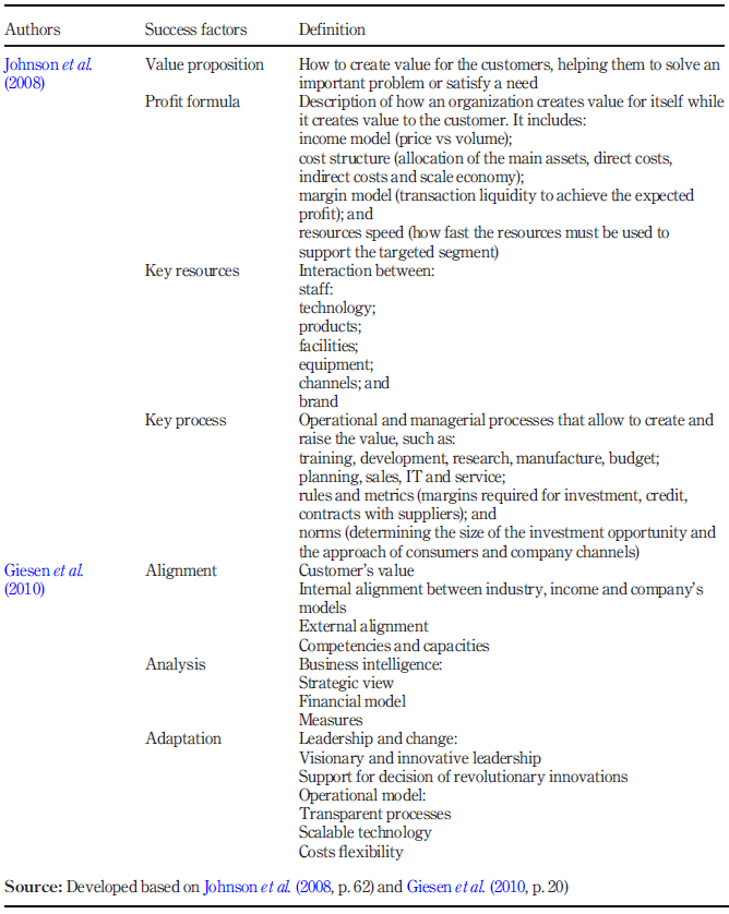 Johnson et al. (2008) pointed out four main success factors for BMI. Giesen et al. (2010) consider three factors co-related to their definition of the types of BMI. These two concepts are presented in Table III to a better understanding of the topic.