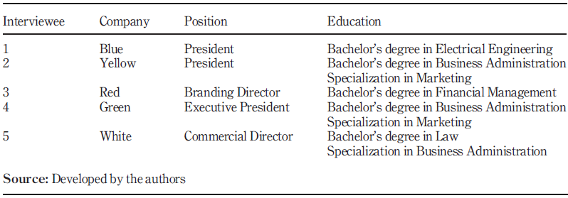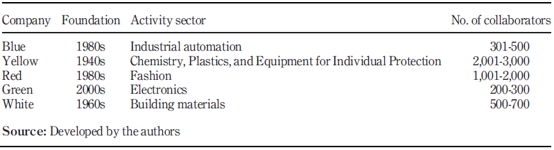 The cases investigated in this study were Brazilian manufactures companies, from medium to large-sized, that have innovated in their BM. According to the Serviço Brasileiro de Apoio às Micro e Pequenas Empresas [SEBRAE] (2015), following the criterion of the number of employees, medium to large-sized companies are commercial and service companies with more than 50 employees and manufactures with more than 100 employees. The companies studied were selected considering accessibility and convenience. Table IV presents the companies investigated in this research. To preserve the identity of the companies, their names will not be disclosed in this article, once an identification by colors is distinguishing them.