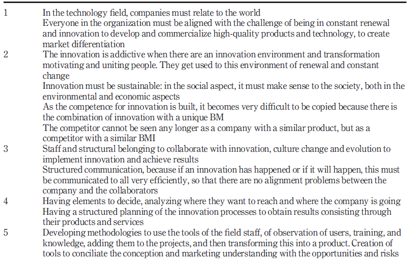 In addition to the difficulties found in the literature, the interviewees mentioned other limitations on their process of BMI. Interviewee 2 believes that incorporating innovation in the organization’s BM is difficult. S/he believes that innovation must be top-down in the structure, and if this is not an option, a corporate decision and is not part of the model business, it will not succeed. The organization must deal with innovation in an organic and systematic way, guiding everyone involved for this purpose. Interviewee 3 considers that the main difficulty for the implementation of innovation is the cultural change. It is a difficult, slow process that requires time to be understood, changed and adapted. With the data analysis, it was possible to identify new difficulty factors reported by the interviewees: the performance of companies in new markets, incorporation of the innovation into the BM, cultural change of employees and transformation of ideas into something marketable, generating outcomes.