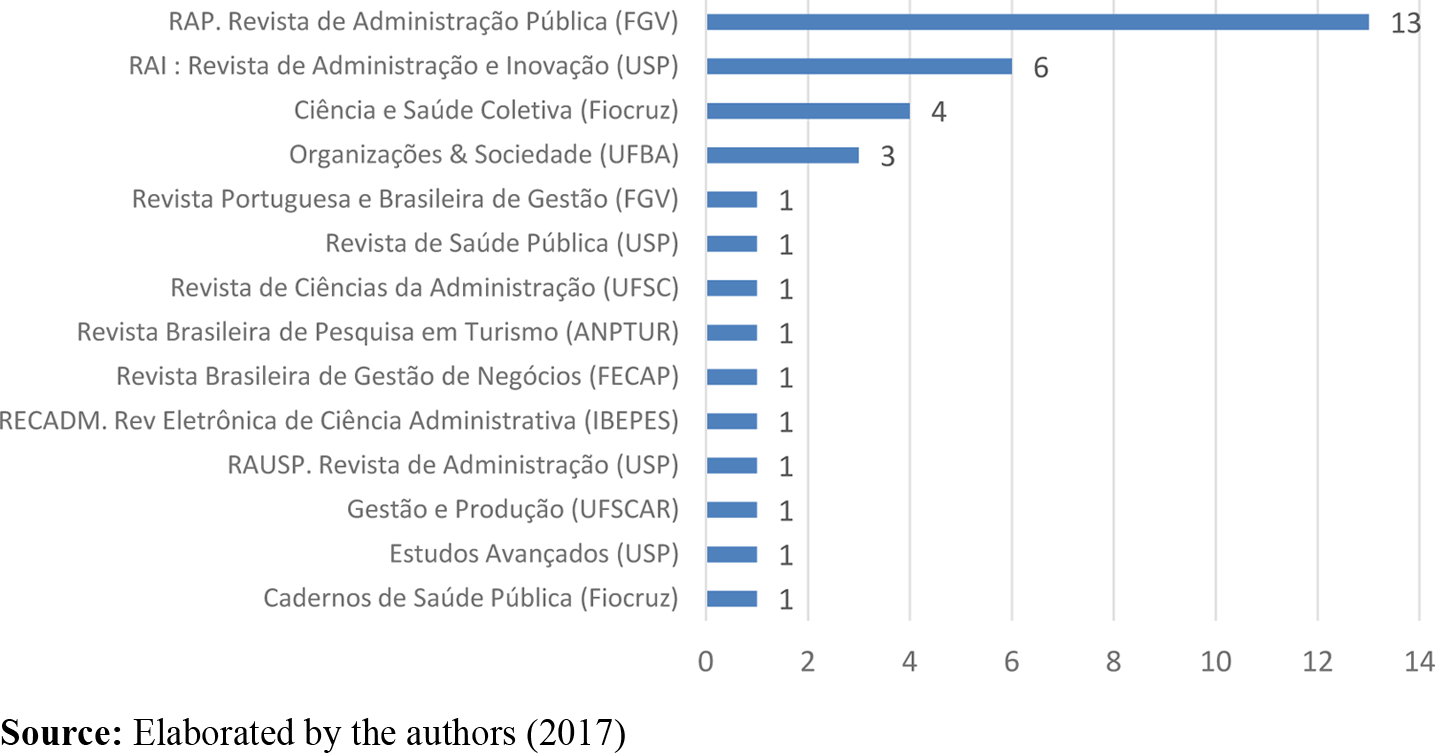In relation to the 164 journals surveyed, only 14 journals addressed the theme of innovation in public administration. Of these, nine journals are classified in strata A2 and five in stratum B1, by the classification performed by the Qualis system. The Journal of Public Administration (RAP) leads the number of publications with 13 articles, followed by the Revista de Administração e Inovação (RAI) and the Revista Ciência ea Saúde Coletiva, which had six and four publications, respectively. These three journals were responsible for 63.8 per cent of the publications on the subject in Brazil. Figure 1 illustrates the publication profile of the topic of innovation in public administration in national journals.