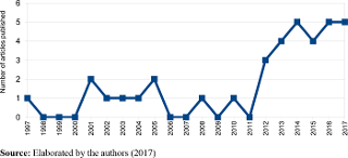 The analysis of the year of publication of the articles indicates that the theme of innovation in public administration began to appear in scientific periodicals in the late 1990s, with the first publication in 1997 (Figure 2). There was a strong growth in the number of publications starting in 2012, when there were, on average, four publications per year. The upward curve at the end of the analyzed period reveals researchers’ growing interest in the subject.