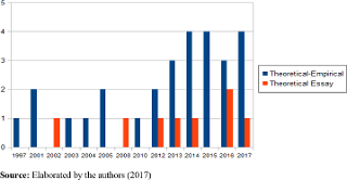The analysis of the articles also showed that approximately 78 per cent are theoretical-empirical and 22 per cent have theoretical test characteristics. Figure 3 shows the distribution of articles according to their classification and year of publication. A predominance of theoretical-empirical articles was observed in the initial years, except for 2002 and 2008, which presented a theoretical essay, but not a theoretical-empirical one. It can be concluded that the theoretical construction on the subject has been incipient, and authors have used international works to build their theoretical framework in applied research. Only in 2012, however, was there a certain degree of regularity of theoretical essays published, with an average of one theoretical essay published per year.