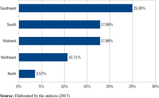 By recognizing the contexts of each innovative experiment, it was possible to identify the region where it was applied. The experiences implemented in the southeast region of Brazil were analyzed by 25 per cent of the articles, which is consistent with the predominance of authors’ institutions in this region of the country. In total, 17.86 per cent of the studies were concentrated in the south of the country, as well as the same percentage in the Midwest, with federal initiatives predominating in the latter case. There were experiences that could not be classified according to the region of the country and, therefore, the sum is not identical to 100 per cent. Figure 4 summarizes this information.