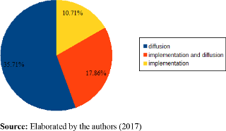 As for the innovation phases, the data systematized in Figure 6 indicates that most of the articles dealt with the diffusion of the innovations (35.7 per cent), as they analyzed aspects after the innovation was implanted into the institution, such as effects and results. Another 10.7 per cent addressed the process of implementing the innovations, while in 17.9 per cent of the articles, the researchers addressed both implementation and diffusion. None of the articles focused on exploring aspects related to the generation of ideas – the invention phase – delineating another research opportunity.