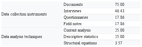 Given this predominance, the prevalence of documents and interviews as the main instruments of data collection is not surprising. Table I shows that documents are used as data collection in 75 per cent of the articles, and interviews are used in 46.43 per cent. It is important to note that, given the possibility of the combined use of instruments, the sum of the percentages may exceed 100 per cent.