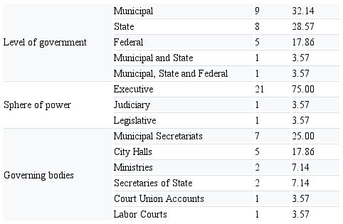 The analysis of the 28 theoretical-empirical articles still allowed the identification of the context of the experiences and innovative practices in public administration. The context of the innovation studied in each article was classified according to the level of government, the type of power and the governing body related to it (Table III). Some contexts could not be classified because they did not involve specific organs and were removed from the analysis. As a result, the sum can be less than 100 per cent.