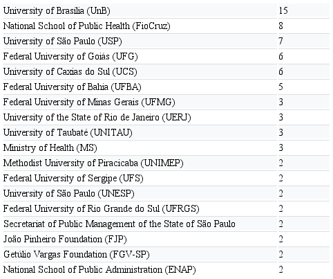 There were 33 institutions linked to researchers studying innovation in the public administration. The institution with the largest number of researchers was the University of Brasília (UnB), with 15 authors. Next, were the National School of Public Health—FioCruz (RJ) and the University of São Paulo (USP), with eight and seven authors linked to them, respectively. Table IV lists the institutions with more than one author who published articles on innovation. In addition to these, there were another 15 institutions with only one author, which are not presented in the Table IV.