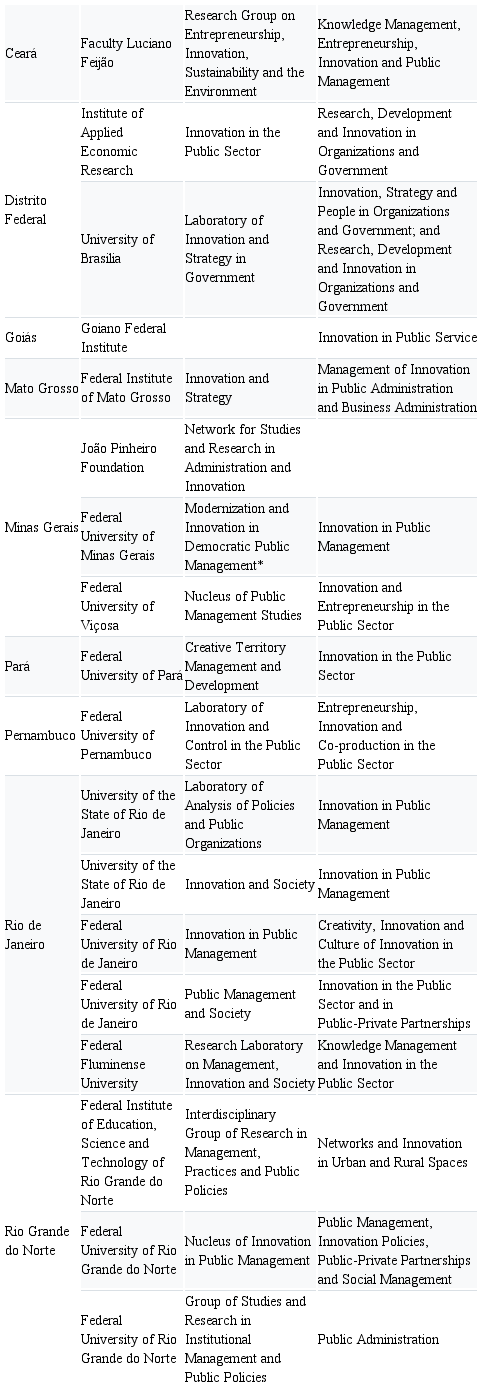 Another important measure of the institutionalization of the topic refers to the capillarity of research groups on the subject. A survey was conducted in the Directory of Research Groups of CNPq using the following search terms: “innovation and public sector,” “innovation and public administration,” “innovation and public management” and “innovation and government.” The search looked for the names of the research groups and their lines of research. As a result, a total of 17 related active research groups were found.