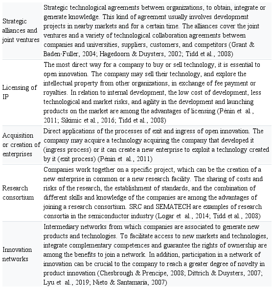 The open innovation model has proved to be a determinant factor for the increase of innovation and economic performance of companies (Cruz-Cázares et al., 2018), in addition to give opportunities in high-technology and knowledge-intensive industries, such as semiconductors (Chesbrough, 2012; Sydow & Müller-Seitz, 2019). To Dahlander & Gann (2010), the opening of the innovation process is based on the idea that a single organization cannot innovate alone. With open innovation, research and development start to be seen as an open system, where the paths for the market and the internal and external resources to the organization are equally important (Chesbrough, 2011; Tucci et al., 2016).