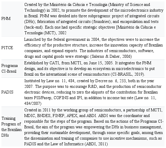 To give Brazilian DHs the opportunity to have global operations, and to encourage the consolidation of the semiconductor industry in the country, the Brazilian Government has instituted laws and programs. Some of them are presented in Table II.