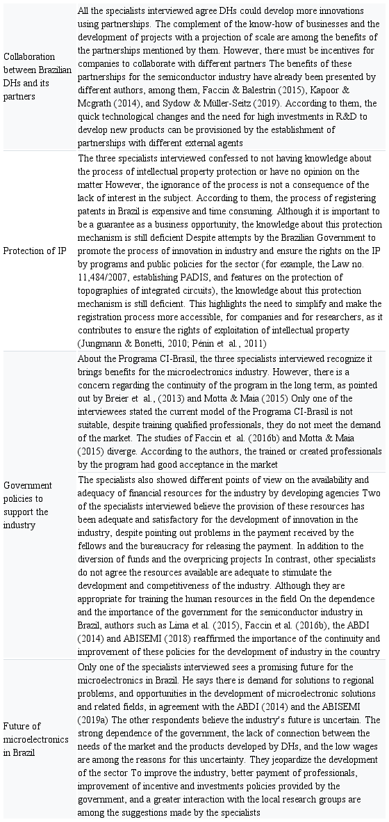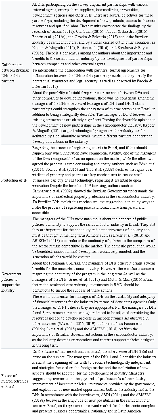 To synthesize the results found, Table V was made. From it, it is possible to make some considerations about the practices of open innovation adopted by Brazilian DHs in the DHs managers’ perception. In addition to the discussion about public policies to support the industry and the future of microelectronics in Brazil.