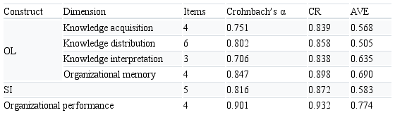 In the proposed model, OL is a multidimensional construct, formed by four distinct dimensions: knowledge acquisition, knowledge interpretation, knowledge distribution and organizational memory. Because of this condition, it was considered a formative construct. In addition, the constructs of SI and organizational performance are reflexive because they consist of a set of related indicators. Therefore, it is a reflexive-formative model, in which the lower-order constructs are reflexive (Lee & Cadogan, 2013).