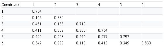 To analyze the discriminant validity, the criterion of Fornell and Larcker (1981) was adopted, confirming with the cross loads of Chin (1998) (for the sake of the brevity, this last analysis is not disclosed). According to Ringle et al. (2014), satisfactory results occur when variances’ squared roots values are higher than Pearson’s correlations, which reflect on higher values (in italics characters) than in the following rows (Table II), as happened in the tested sample, confirming reliability and validity of the model constructs.