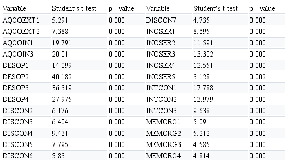 Student’s t-test was used to evaluate the significance of the relationships and correlations, an adequate test for situations in which the sample size is small (Hair, Hult, Ringle, & Sarstedt, 2016). According to the results, satisfactory values for Student’s t-test should be ≥ 1.96, with p-value < 0.05 (Ringle et al., 2014; Hair et al., 2016) (Table III). Therefore, about the evaluation of the measurement model, the criteria of convergent validity, discriminant validity and CR were met.