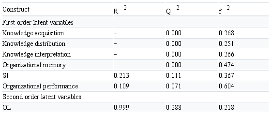 The results obtained for the R2 indicate the quality of the adjusted model. The model variables portray a small effect (organizational performance = 10.9 per cent), moderate effect (SI = 21.3 per cent) and large effect (OL = 99.9 per cent), according to Cohen (1988) criteria. OL dimensions do not reveal any value for R2. An explanation for this is given by Lee and Cadogan (2013): when a repeated indicator approach is used, and the higher-order construct is formative, lower-order constructs already explain the entire variance of the higher-order ones (R2 equals 1). Therefore, other antecedent constructs cannot account for any variance of higher-order constructs and, consequently, their paths to higher-order constructs will be zero or not significant.