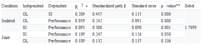 After verifying the adjustment indexes of the model, the results of the mediation test are presented: OL → | SI | → organizational performance. The method chosen for the verification of mediation was the path analysis of Baron and Kenny (1986) and the Sobel test (Soper, 2017) shown in Table V. Baron and Kenny (1986) propose four conditions for mediation analysis: