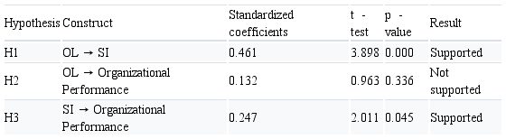However, a positive relationship between innovation and performance was proven giving support to H3 (Table VI); the authors consider that innovation plays a significant role between OL and organizational performance. In the analysis of H3, the relationship between SI and organizational performance was supported with values of Γ = 0.247 and R2 = 0.109. This result is consistent with previous studies (Darroch, 2005; Lopez et al., 2005; Chen et al., 2016).