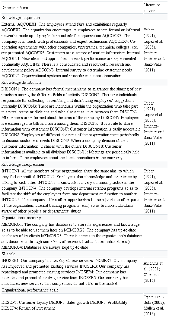 The data collection instrument consisted of three blocks of questions. The first one contains the items related to OL, the second addresses the items of SI and the third deals with organizational performance (see complete questionnaire in the Appendix). A seven-point Likert-type scale ranging from 1 (strongly disagree) to 7 (strongly agree) was used, with the exception of organizational performance, in which respondents were asked to indicate the level of performance of their organization compared to the competition, considering the period over the past three years, ranging from 1 (much worse) to 7 (much improved). Control variables included firm size and age (Tippins & Sohi, 2003).