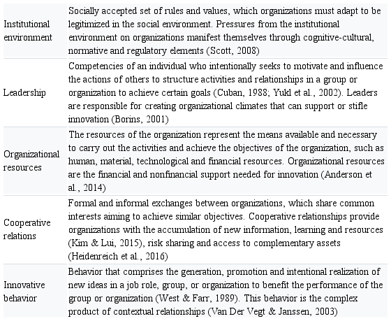 Taking into account different levels of analysis – individual, organizational, interorganizational and institutional – Castro and Guimaraes (2019) suggest a multilevel analysis of dimensions that can influence innovation process in justice organizations: institutional environment (institutional level), leadership (organizational level), organizational resources (organizational level), cooperative relations (interorganizational level) and innovative behavior (individual level). This research uses these dimensions as parameters, and Table I gives their constitutive definitions.
