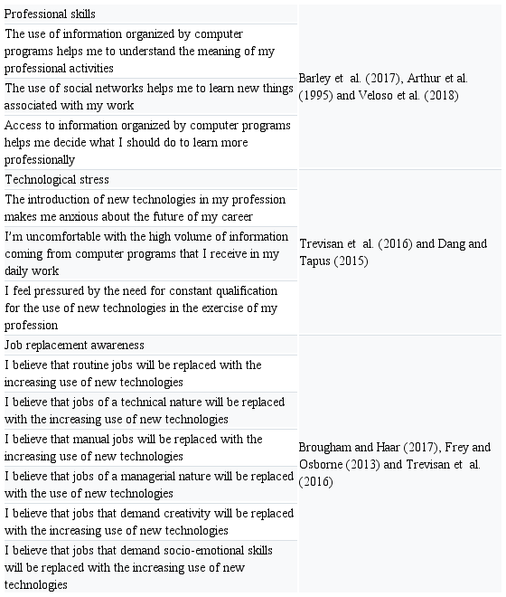 The research instrument was composed of two parts, the first of which is made up of the questions contained in the inventory of career anchors, prepared by Schein (1990). In the second part, 15 statements were presented with the purpose of ascertaining perceptions regarding the incorporation of technological innovations in the work environment, including professional skills (intelligent careers); the stress associated with technological innovations (technological stress) and the awareness regarding the possibility of replacing jobs with technology.
