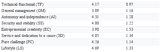 Table 2 are the means and standard deviations of the respondents’ career anchor scores.