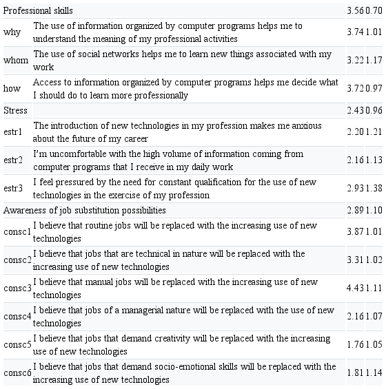 The category with the highest average was professional skills and the lowest was the one dealing with technological stress. Thus, apparently, respondents tend to agree that they develop intelligent careers with the use of technology and disagree with the incidence of stress resulting from the context of technological innovation.