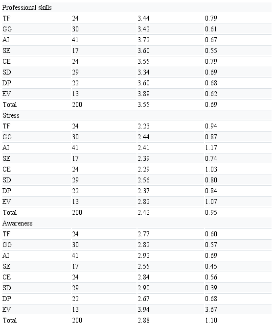 Thus, the constructs that presented significant mean differences were professional skills (F = 2.47 p < 0.05) and awareness (F = 2.20 p < 0.05). However, there were no significant differences in stress construction (F = 0.61 p < 0.05). Therefore, H1 and H2 were confirmed and H3 was rejected.