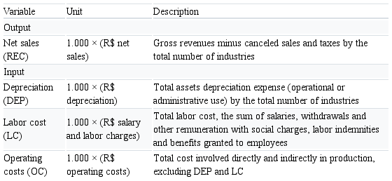 Charnes, Cooper and Rhodes (1978) state that the relationship between engineering and economy has been outlining new perspectives, which present new interpretations and paths to be used in distinct managerial evaluations and controls. Production engineering predicts that to evaluate every and any system, it is necessary to define the input and output variables. The inputs are also known as resources that will be transformed into an output; i.e. the desired result (or not) of this operation. According to such statements, the independent firm, which represents the object analyzed herein, can also be known as the decision-making unit (DMU).