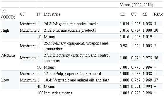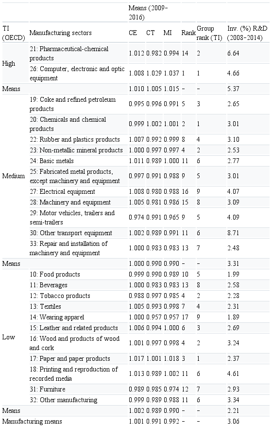 However, conforming to the information displayed in Table 2, the group with high TI – conforming to the classification of OECD – presented the highest average MI (1.015), which indicates that this is the group of sectors with the highest TFP average increase. Among this group, sector 26 (computer, electronic and optic equipment) presented the highest average MI (1.037). On the other hand, the sectors with medium and low TI presented a decrease in their TFP (MI < 1.000); respectively, 0.990 and 0.989. Therefore, we can infer that the sectors with high TI, on average, present the highest increase of TFP over the period under analysis.