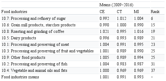 According to Table 4, the processing and refinery of the sugar industry (10.7) were the only ones among the food industries to demonstrate an evolution in its technology frontier, with a CT of 1.012. In addition, to the production of ethanol (Silva et al., 2019), sugar cane is an input used in the sugar refinery industry. As we analyzed, the main innovations of the food sector are based on the formulation of ingredients (Gouveia, 2006) meeting nutritional orientations and regulations (Bigliardi & Galati, 2013). The new orientations and regulations – in addition to the current demand for sugar reduction (ABIA, 2018b) – boost such evolution in the technology frontier. Besides, only industries 10.8 and 10.7 (MI of 1.004) indicated an average increase in their TFP during the period under analysis. In the first industry, the increase in the TFP was due to CE; in the second, CT.