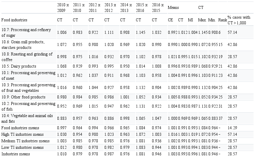 By ranking the average values of CT of the 24 manufacturing sectors, of the 17 available positions (considering that there was a tie between some sectors), the food sector ranked 10th. When we analyzed the group with low TI, of the 11 industries, the food sector ranked 5th. In both cases, we verified intermediate positions; slightly below the average of the manufacturing sector (0.991).