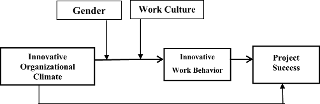 Some scholars have argued that IWB can expedite the process of gaining competitive advantage and can enhance OP (Hogan & Coote, 2014; Moss Kanter, 1988; Runco, 2004; Scott & Bruce, 1994; Shih & Susanto, 2011). Nonetheless, their approaches were inadequate with respect to fundamental conceptual framework (Shanker et al., 2017); and focus largely on examining the connection between IOC and OP. The present study makes a novel contribution by studying the influence of IOC and IWB on project success (PS). PS is used here as a proxy of OP because traditionally a project is thought to be successfully completed when the performance objectives, funds, budgets and deadlines are successfully fulfilled (Shenhar, Dvir, Levy, & Maltz, 2001). Approval of the client, work quality, cost, scope and time are the issues reflected upon while evaluating PS (Guide, 2001). Additionally, moderating effect of gender and work culture on the relation between innovative climate and behavior is tested in the study.