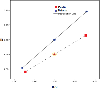 The interaction term was found to be non-significant (Table 5). Because the confidence interval included zero in the interval and was not significantly different from zero (coefficient = 0.01, S.E = 0.039, p = 0.199, CI = −0.21 to 0.054), therefore the hypothesis H5 has been rejected. However, H4 of the study was fully supported, as the data analysis provided evidence of a significant moderation of work culture. The interaction term was found to be significant (Table 5). Because the confidence interval did not include zero in the interval and was significantly different from zero (Coefficient = 0.08, S.E = 0.041, p < 0.001, CI = −0.13 to −0.037), so the hypothesis H6 has been accepted i.e. the positive association between IOC and IWB was found to be stronger in the private sector (private: 0.54, p < 0.001; public: 0.22, p < 0.001; Table 6) as compared to the public sector (Figure 2).