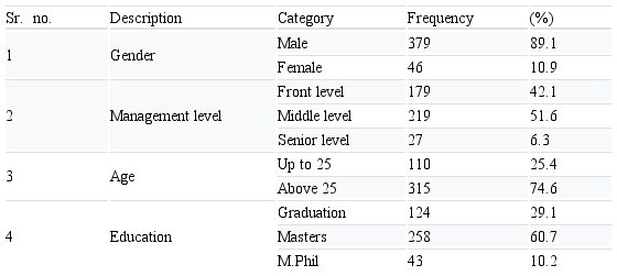 Convenience sampling technique was used to obtain the study sample because of the geographic dispersion, cost and time constraints for conducting a survey (Jahanzeb & Fatima, 2018). Approximately, 600 questionnaires were distributed in Pakistan. Out of these, 429 questionnaires were returned and had been found complete, resulting in a response percentage of approximately 71.5%. After removing incomplete questionnaires having missing responses and influential outliers, final 425 usable questionnaires were used for the analysis. Thereby, net response rate reached 70.83%.