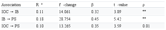 It was ensured that all scales are reliable as Cronbach (1951) alpha’s values ranged from 0.7 to 0.8, showing average to good consistency (George & Mallery, 2016) (Table 2). Further, correlation analysis was conducted to find out the relationship among variables along with the strength of their association. The results showed that IOC has moderate positive association with IWB (r = 0.309) and PS (r = 0.438). Moreover, IWB has also moderate positive correlation with PS (r = 0.304). The strength of association is showing that an upward trend in IOC leads to better IWB and higher the PS.