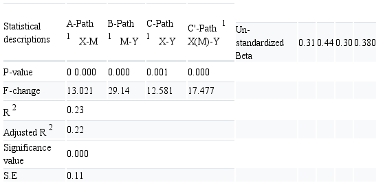 To check the mediating effect of IWB in relationship between IOC and PS, Preacher & Hayes (2004) mediation test was applied with 5,000 bootstrapping. The results demonstrated that IWB has partial mediating effect on IOC-PS relationship (Table 4). A-Path revealed that there is a positive relationship between IOC and IWB with β = 0.31, at 95% confidence level. Further, B-Path explained that IWB has positive relationship with PS having β value 0.44 with significant p-value. C and C’-Path showed direct and indirect relationship between IOC and PS with mediating effect of IWB. The analysis of both paths give evidence that IWB partially mediates the relationship between IOC and PS with β = 0.30 at significant p-value (C-Path) and β = 0.38 at significant p-value (C’-Path) at 95% confidence level (Table 4). The overall statistic of H2 are also significant with R2 = 0.23 and S.E = 0.11 that has validated the mediation effect of IWB.