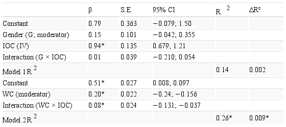To check the moderating effect of gender and work culture in the association between IOC and IWB, PROCESS macro developed by Hayes (2013) was used with 5,000 bootstrapping samples. H3 was not supported by our data i.e. gender does not moderate the positive relation between IOC and IWB.