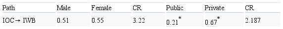 After getting the results from process macro, which demonstrated no moderation effect of gender and a significant moderation of work culture between IOC and IWB, the critical values and path coefficients were calculated to check the moderating role of these two sets on the aforementioned association. The values of Table 7 show that women are no different to men employees with respect to innovative behavior due to IOC. Additionally, individual’s innovative behavior because of the innovative work climate is more widespread in the private sector in comparison to the private sector.