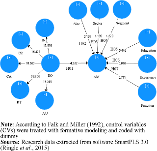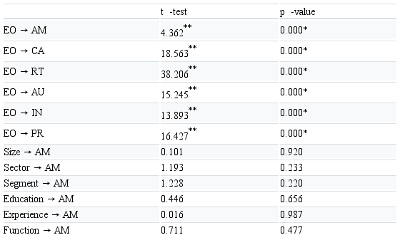 To assess the level of significance of the structural model, showing the causal relationship between the two constructs, the Student’s t-test was used (Hair et al., 2014; Götz et al., 2010). Calculations were performed between the original samples of each variable (or each construct) and their samples obtained by using the algorithm option bootstrapping Smart PLS (Ringle et al., 2014). For the structural model to be considered adjusted, it is expected that the result of the values of Student’s t-test are p ≤ 0.05 and t-values ≥ 1.96. The results (Table 5) show values of the path coefficients above 1.96, with a 1% significance, proving the existence of a causal relationship between the LVs (the independent variable EO in the dependent variable AM) (Hair et al., 2014), as the values are much higher than recommended and identifying the 99% probability of paths existence. The CVs did not show any interference or significant causal relationship for the use of AM.