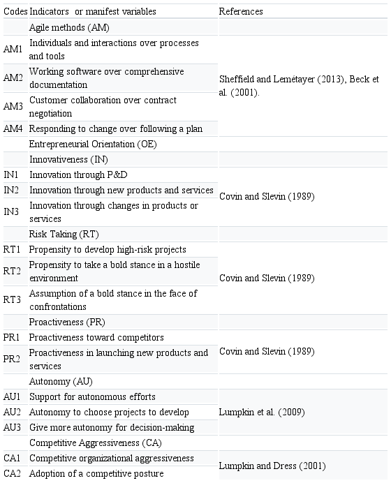 The questionnaire used for the survey consisted of an initial “qualifying” question to verify whether the professional is or was part of a project team that had used an AM, and the questionnaire was continued only in cases where the answer was affirmative. The questionnaire had an initial section to characterize the AM framework used, the organization and the respondent; subsequently, sections with questions about AM and EO using a five-point Likert scale were presented. A code was used in data analysis for each indicator in the questionnaire. Thus, the data collection instrument included 13 indicators of EO and 4 of AM (Table 1). The AM scale was extracted from Sheffield & Lemétayer (2013), created from the values of the agile manifesto (Beck et al., 2001). The EO scale was based on studies by Covin and Slevin (1989), Lumpkin and Dess (2001), Lumpkin, Cogliser, and Schneider (2009), as well as by Martens et al. (2018), who applied it to professionals working with projects.