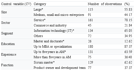 Before testing the model, the control variables (CVs) of company size, sector and segment were prepared, as well as education, experience and role of the respondent. They were treated with formative modeling and coded as dummy variables. Thus, in each CV, categories were chosen as a reference, according to the guidance of Falk and Miller (1992). Table 2 shows this categorization and details.