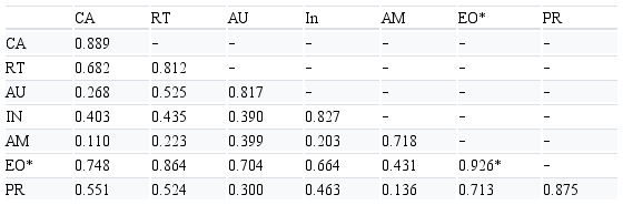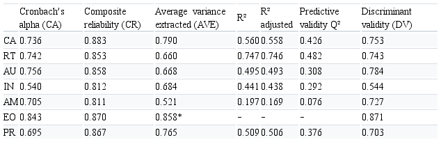 With the return of 206 valid responses, the reliability of the model and valid responses was assessed using Cronbach’s alpha (CA), used to analyze whether the sample is free from bias or whether the set of responses is reliable. The values are greater than 0.70, which is considered satisfactory (Ringle et al., 2014), except for the latent variable IN (0.540). This may represent a bias in the survey responses in the indicators that constitute innovativeness. It can also be explained by the fact that innovativeness is a precondition of the model of AM; however, new research is suggested to equalize this limitation now presented.
