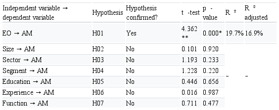 Figure 2 shows the final structural model and Table 6 presents the results and the hypothesis test of the structural model, tested using the bootstrapping algorithm (Hair et al., 2014). This analysis showed that the EO construct positively affects the use of AM according to the Student’s t-test (4,362 and with P-value < 0.0001) and explaining more than 19.7% of the effects of EO on the use of AM, confirming the H01.
