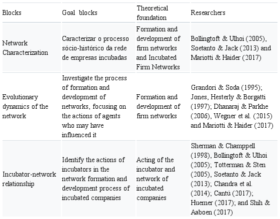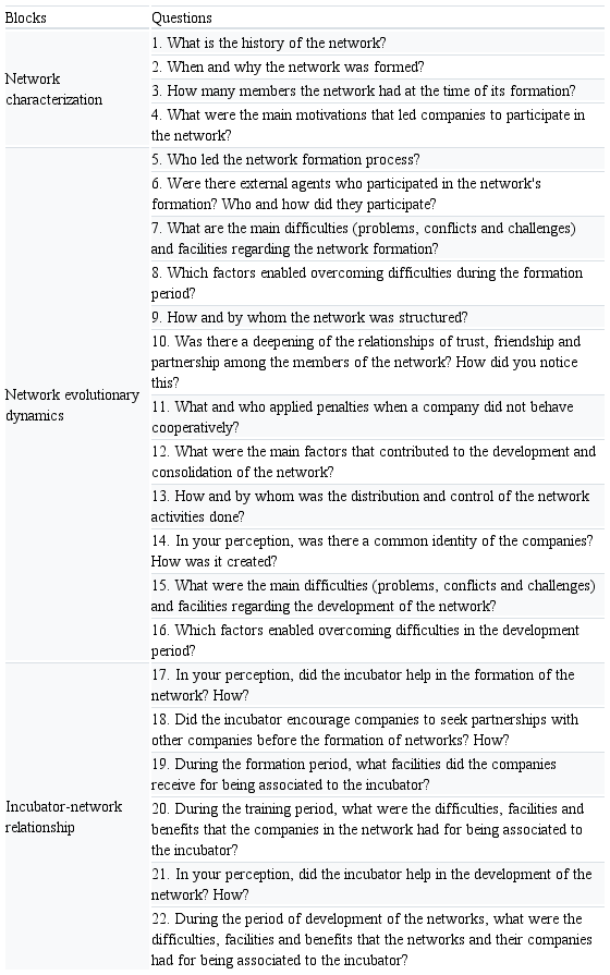 For the operationalization of the interviews, a script was developed with 22 open questions, Table A1 of the appendix, about the relationship of the incubator and the network within the process of formation and development of the incubated company networks. Thus, these questions were subdivided into three research blocks, Table 1, according to the theoretical basis developed in this work.